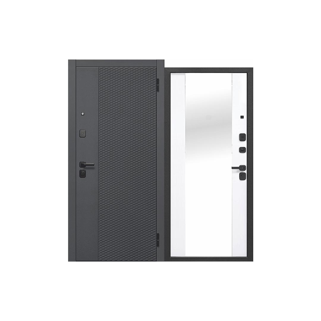 Внешнее покрытие: фрезерованная МДФ-панель "Чёрный кварц"Внутреннее покрытие: фрезерованная МДФ-панель "Эмалит Белый" накладное зеркалоТолщина дверного полотна: 75ммНаполнитель: пенополистиролУплотнитель: 2 контура уплотнителя из вспененной резиныПетли: 2 шт., наружные, открывание 180°Размеры: 860х2050 мм, 960х2050 мм…